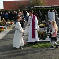 Bei strahlendem Herbstwetter nahmen zu Allerheiligen viele Menschen an der Feier auf unserem Friedhof teil. Mit berührenden Texten vermittelten Christa und Diakon Franz Habith den FriedhofbesucherInnen die zentrale Hoffnung unseres christlichen Glaubens, dass unsere lieben Verstorbenen neues Leben bei Gott erwarten dürfen. Die Namen der im letzten Jahr Verstorbenen wurden vorgelesen. Musikalisch wurde die Feier von der MUZ festlich umrahmt. Nach der Gräbersegnung boten unsere Minis ihre selbst gebackenen Allerheiligenstriezerl an. Danke für die freiwilligen Spenden!