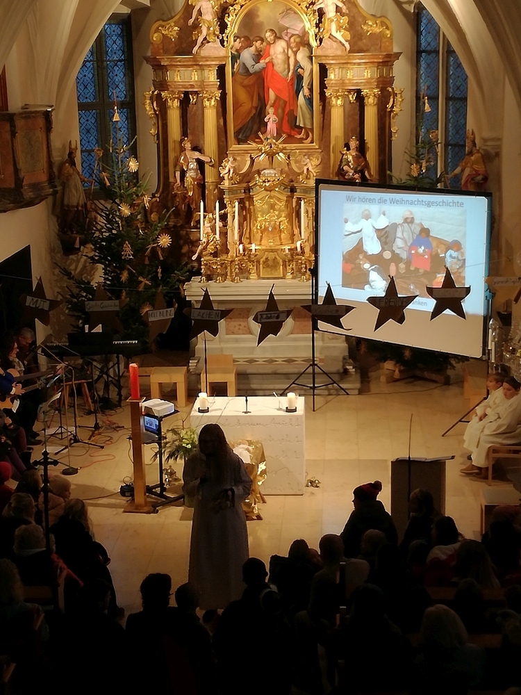 Mit vielen Kindern, Eltern und Großeltern feierte Wort-Gottes-Feier-Leiterin Anja Asel am Nachmittag des Heiligen Abends in unserer weihnachtlich geschmückten Kirche die Geburt des Jesuskindes. Die Feier wurde von unserer „Kirchenband“ mit wunderbaren Weihnachtsliedern musikalisch gestaltet. Begeistert sangen Groß und Klein mit und man spürte die Freude aller, am „Geburtstagsfest des Jesuskindes“ teilzunehmen.